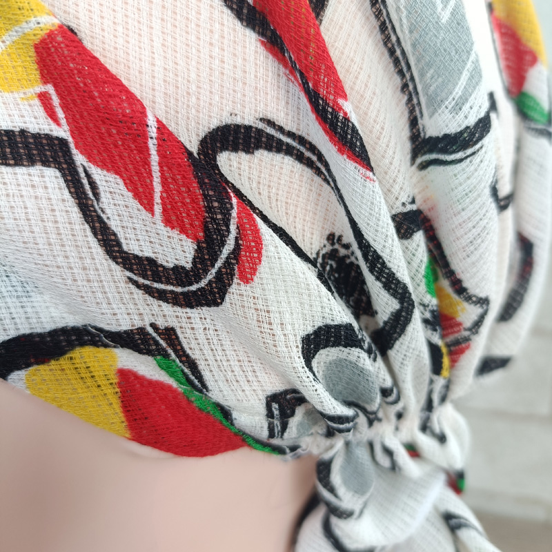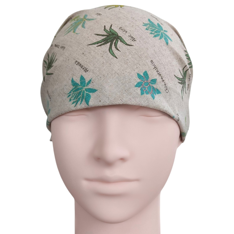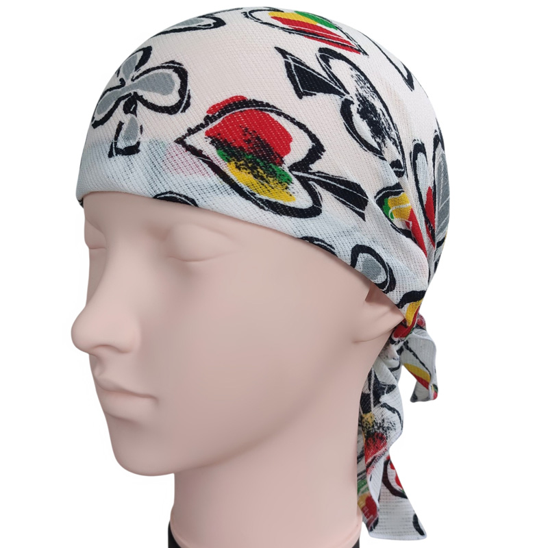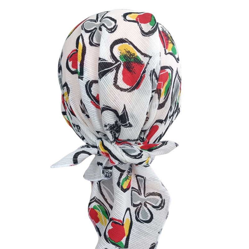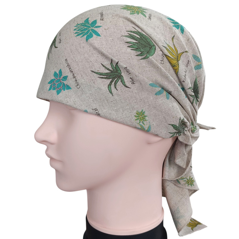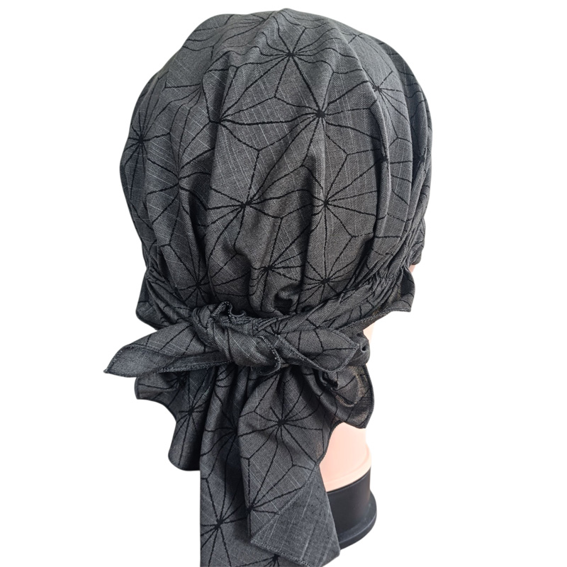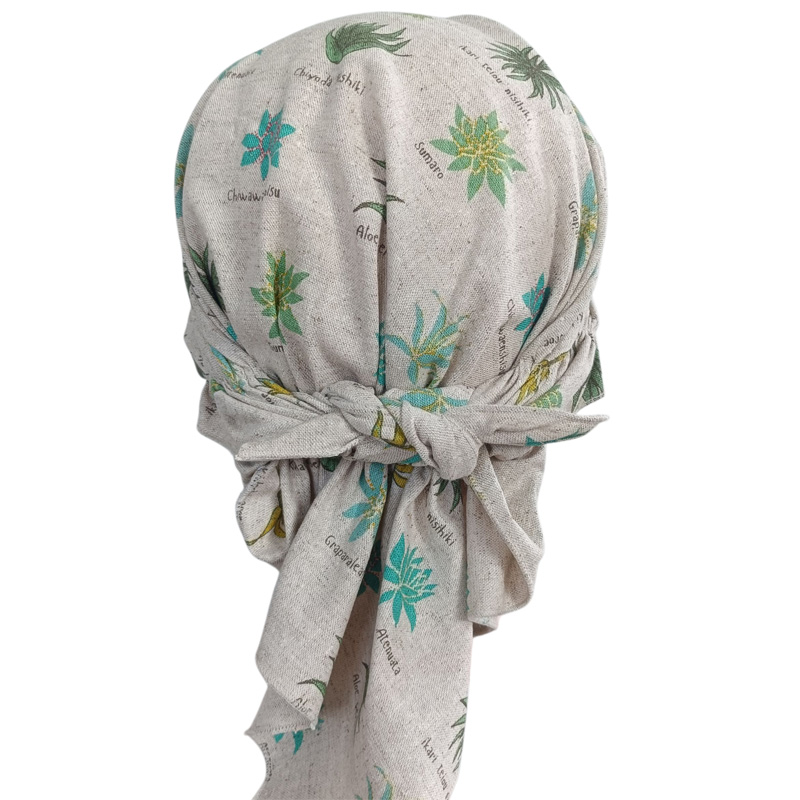 頭囲が大きく一般的なメンズサイズの帽子がきつい程なのでかぶれるか心配しましたが、後ろのゴムがゆったりしてるので楽にかぶれました。後ろの結び目は少し小さくはなりますが結ぶことができました。帽子サイズに出来上がっているのでかぶる深さの調節はできないのが心配でしたが思ったより深くてしっかり頭全体にかぶせることができました。髪の量が多いので帽子をかぶると髪がぺたんこになって脱ぐのが嫌でしたが、バンダナ型なら外出先でも脱ぐ必要がないので気楽です。 |